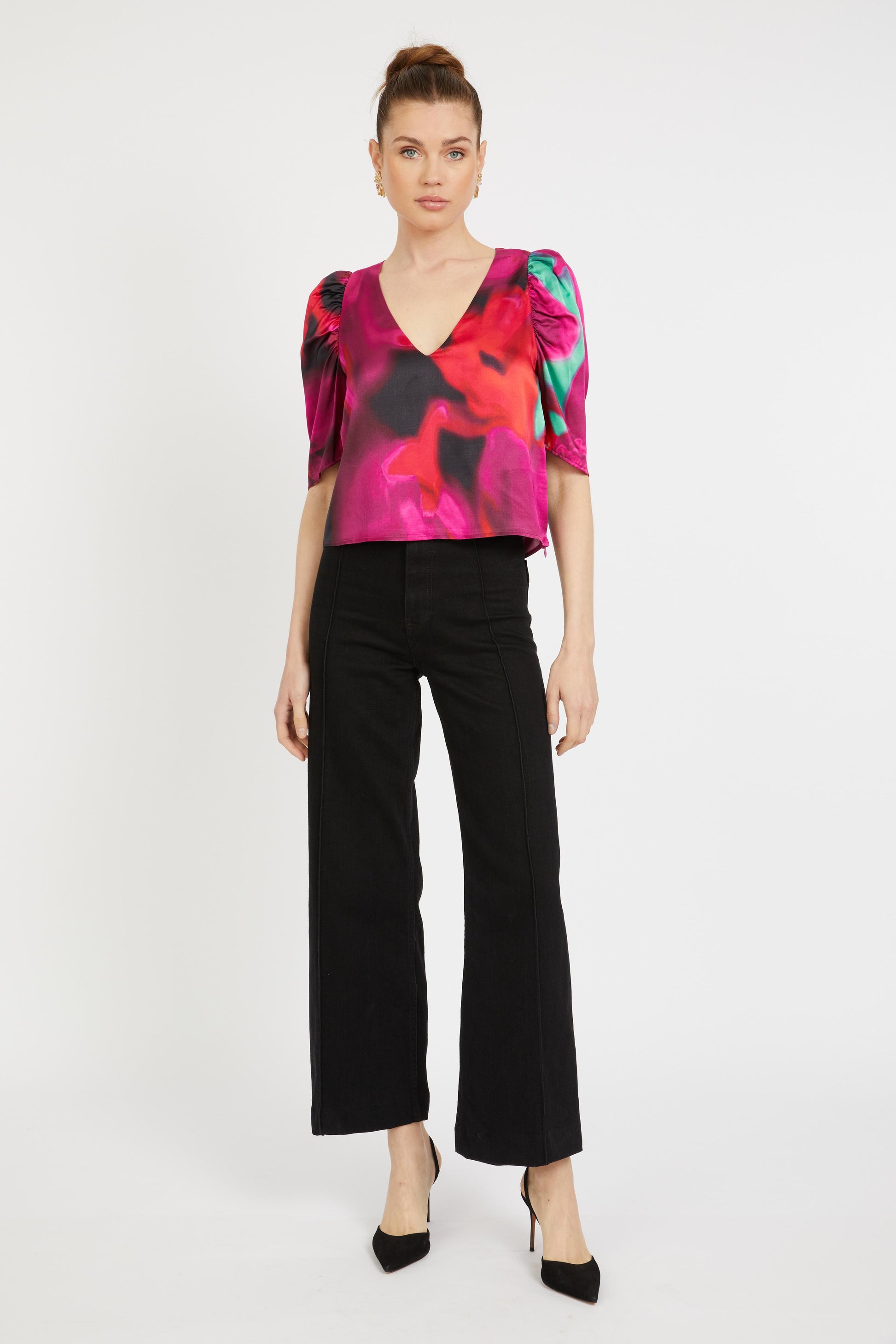 The Arden Top in the Blur Iris Bloom print is a V-neck style blouse featuring ruched, elbow-length puff sleeves that add a touch of volume and femininity. The relaxed silhouette is thoughtfully detailed with bust darts, offering a more tailored fit through the top while maintaining ease throughout the body.