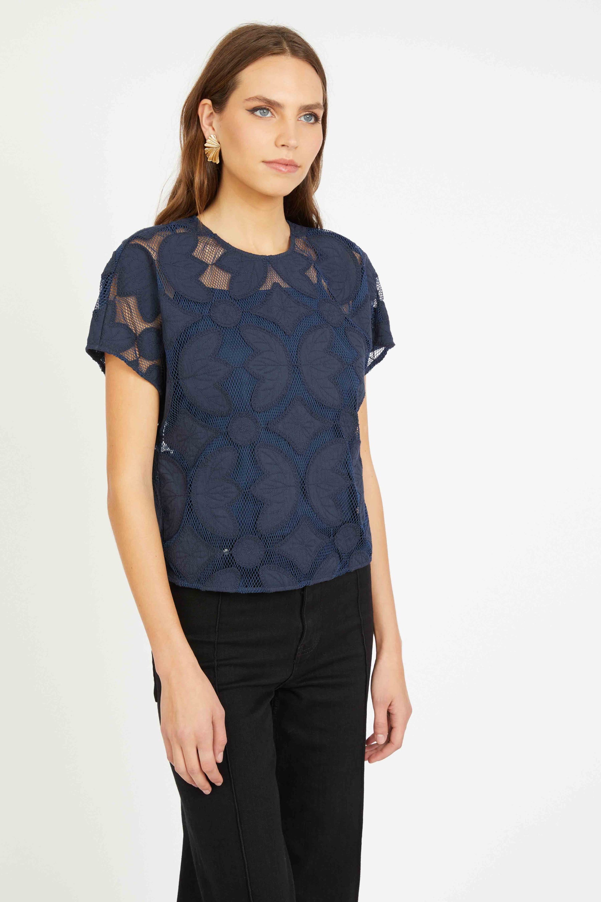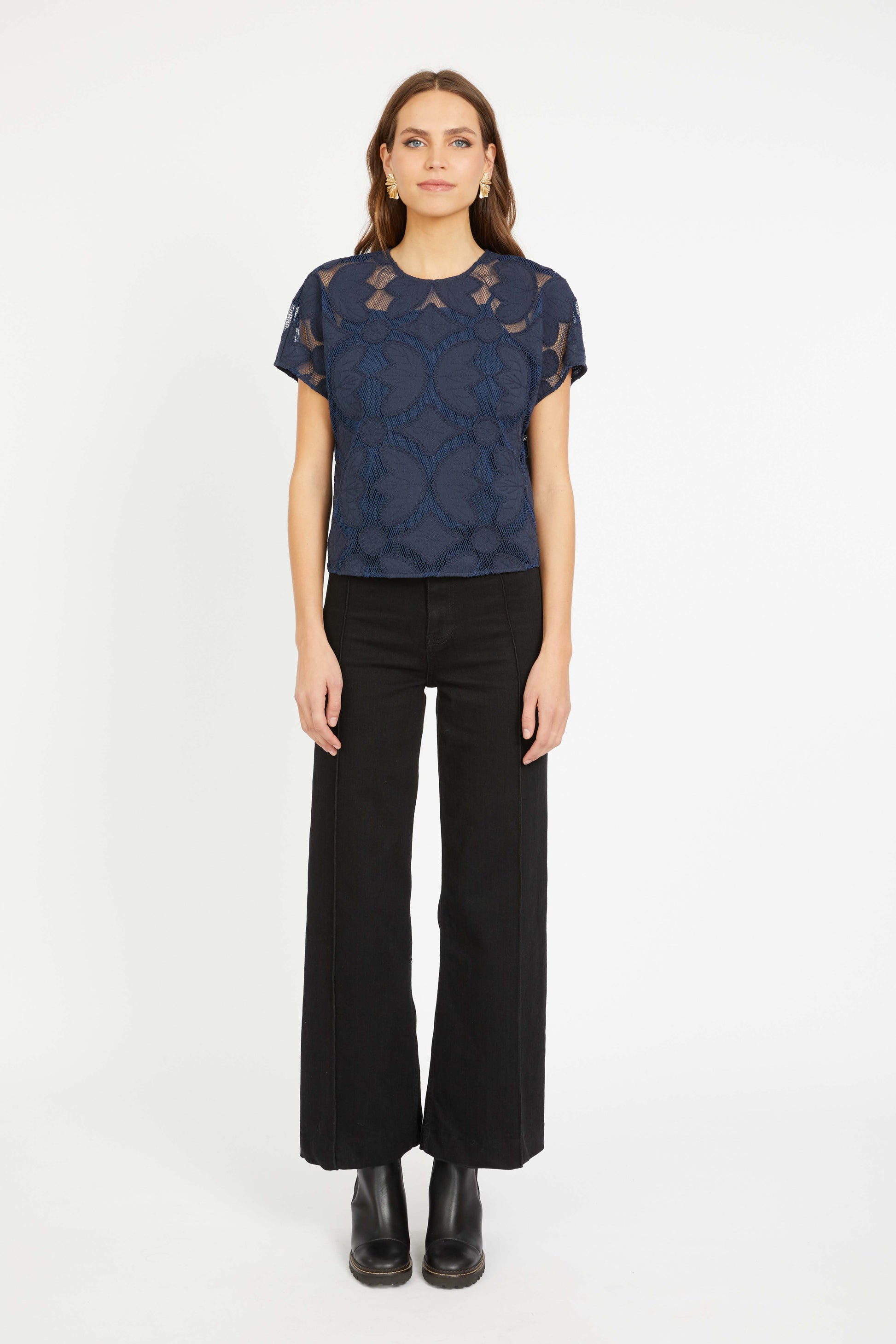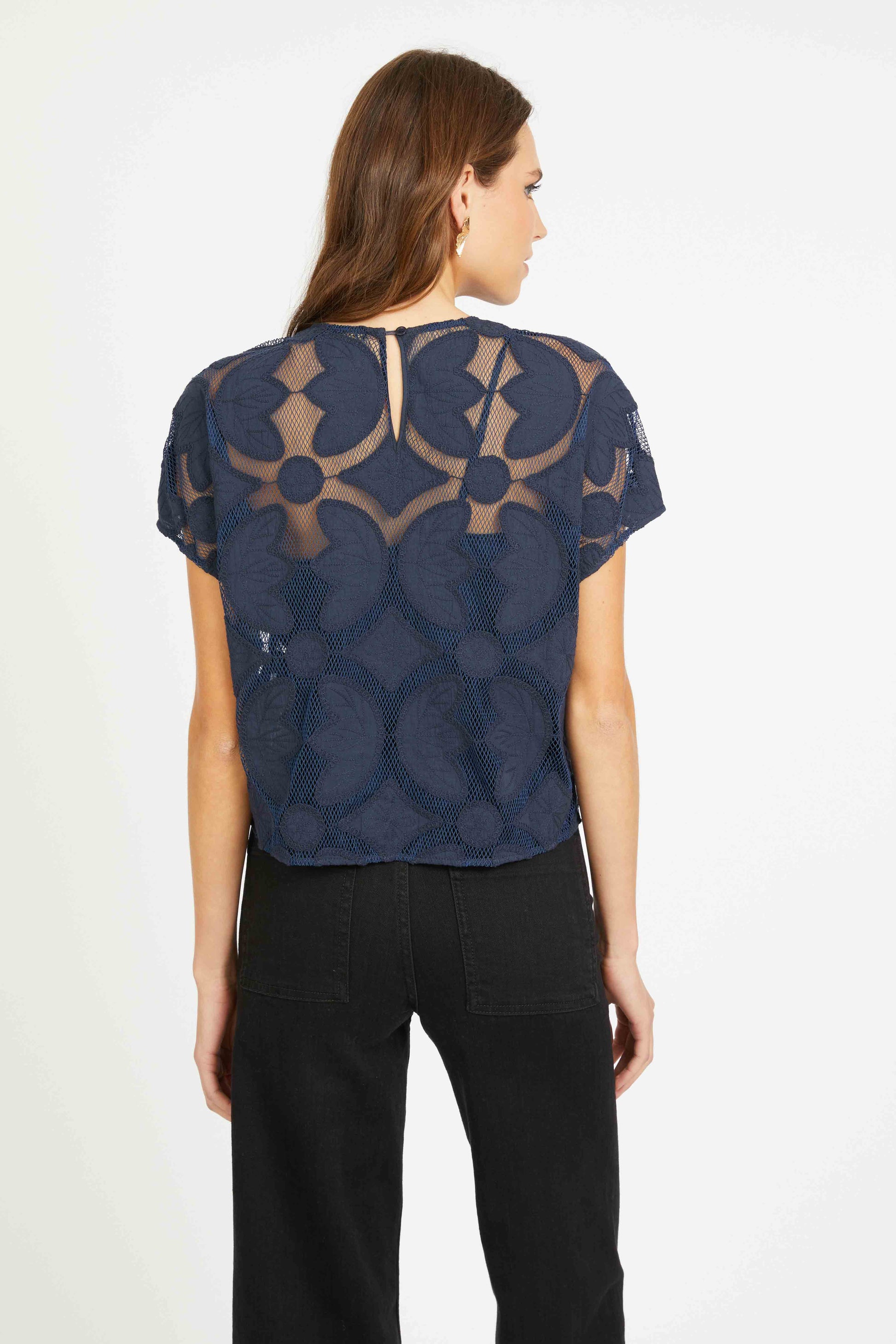 The Carmen top in navy lace is a short sleeve, crew neck style designed with a boxy silhouette and bold texture. Featuring floral-inspired embroidery layered over open mesh, this top balances graphic detail with subtle sheerness.