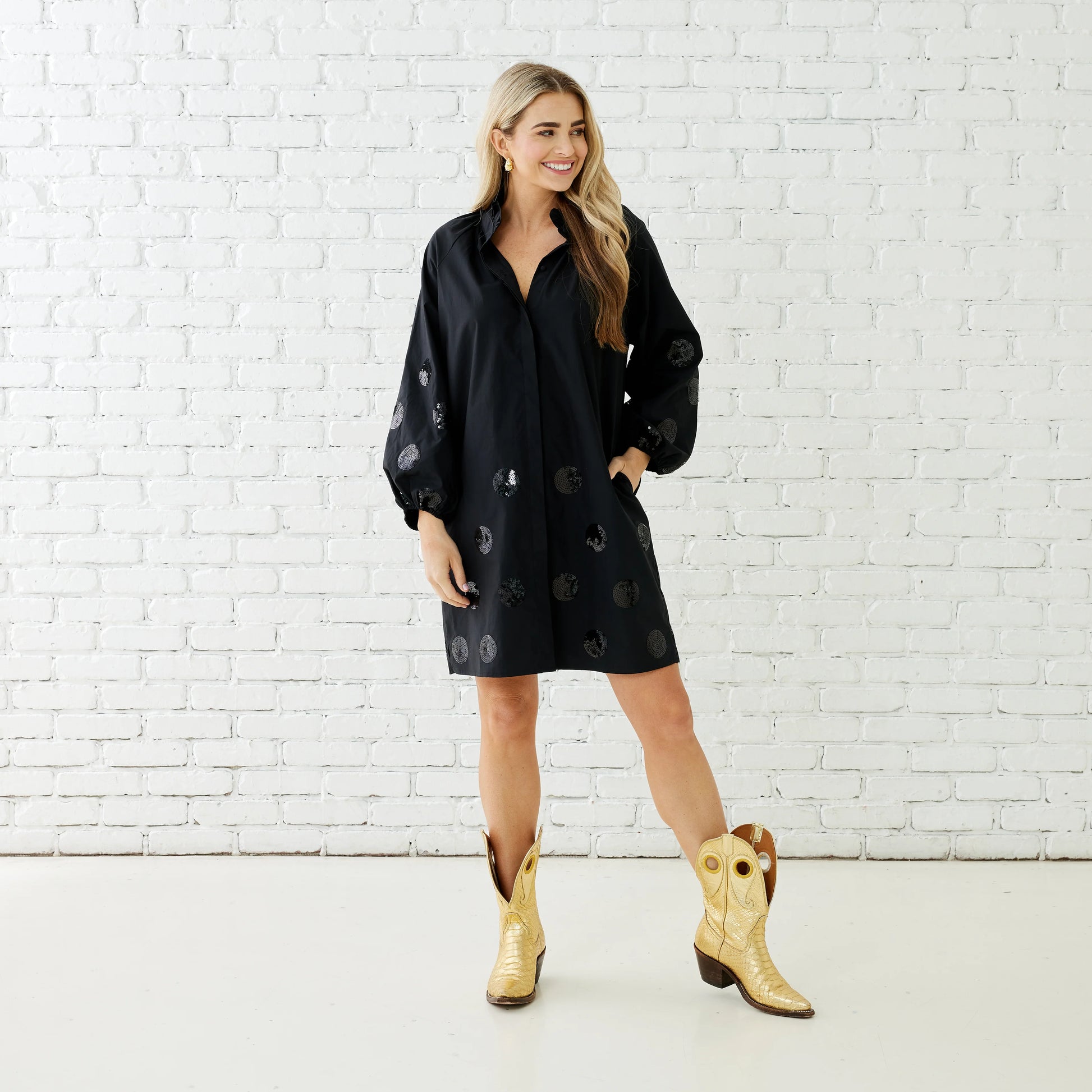 Effortless elegance with a touch of festive shine. The Celia Sparkle Dress is crafted in crisp cotton poplin and adorned with sequin circle detailing for a playful yet elevated look. Featuring a ruffled collar, covered buttons, and a relaxed silhouette, this dress offers all-day comfort while still making a statement. The elastic cuffs and hidden pockets complete the design with thoughtful, wearable ease.