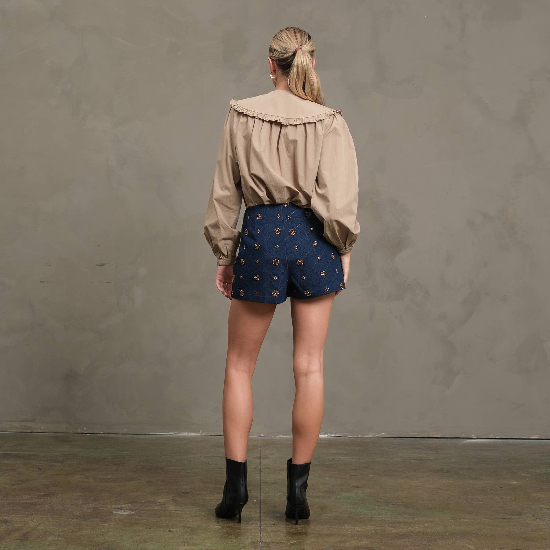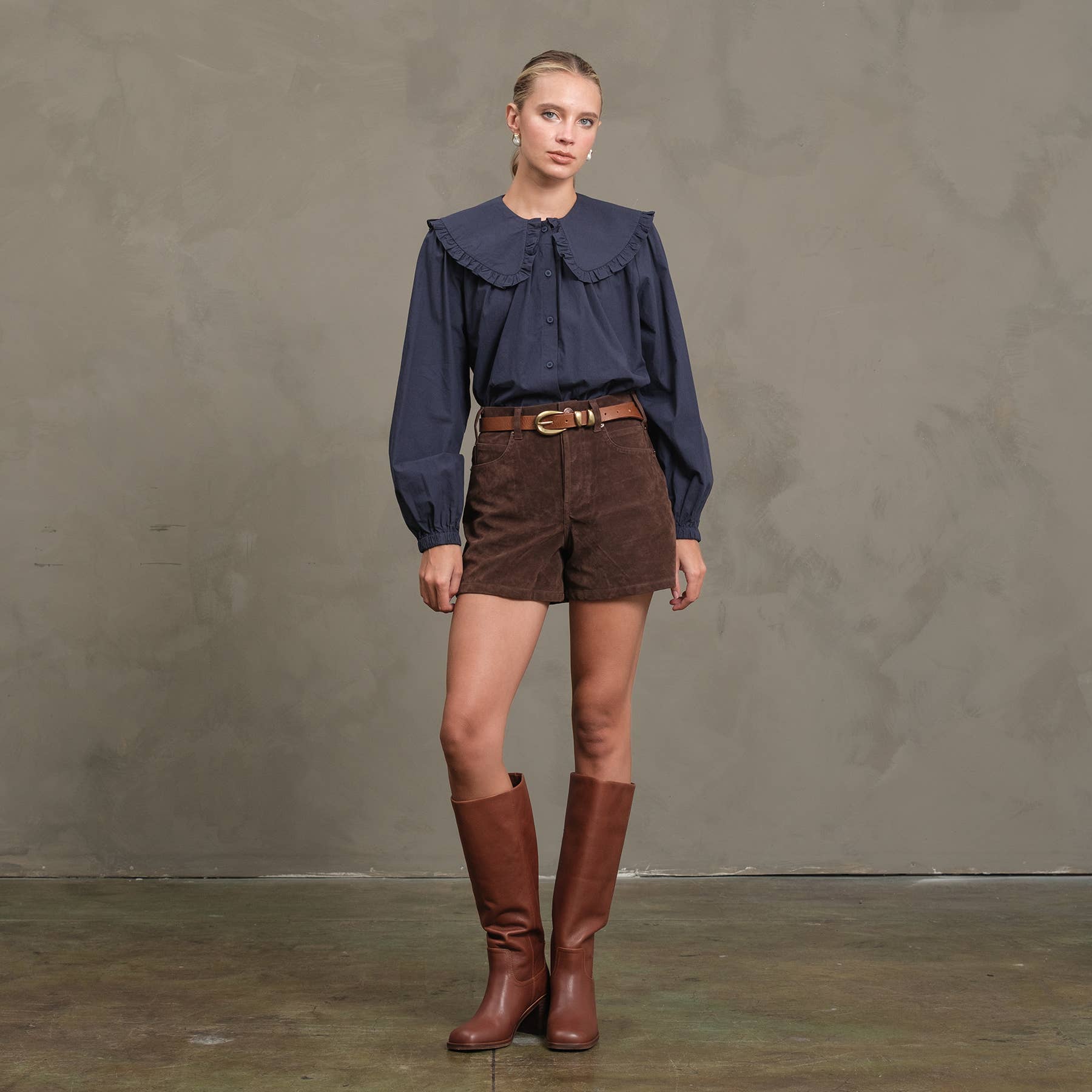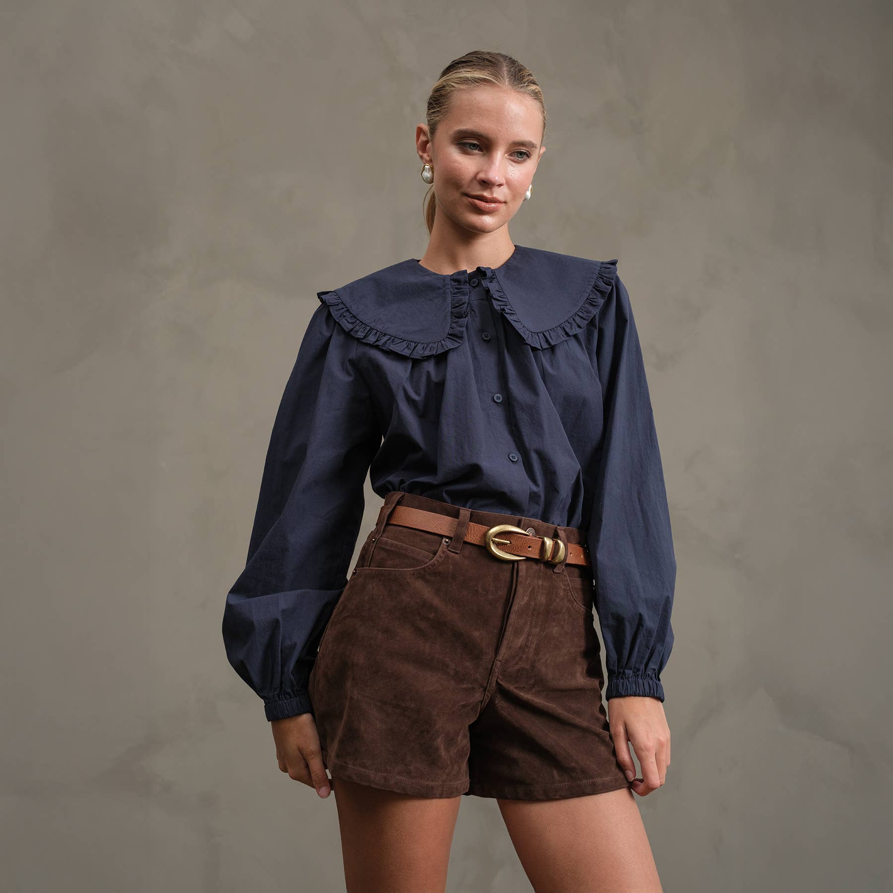 -Oversized frill Peter Pan collar -Lightweight cotton woven fabric -Button-down front -Gathered detail at bust -Long sleeves with elastic cuffs ** Model is wearing size S Model height: 173 cm / 5FT 8IN 100% CottonFrill Collar Cotton Blouse - RT1175