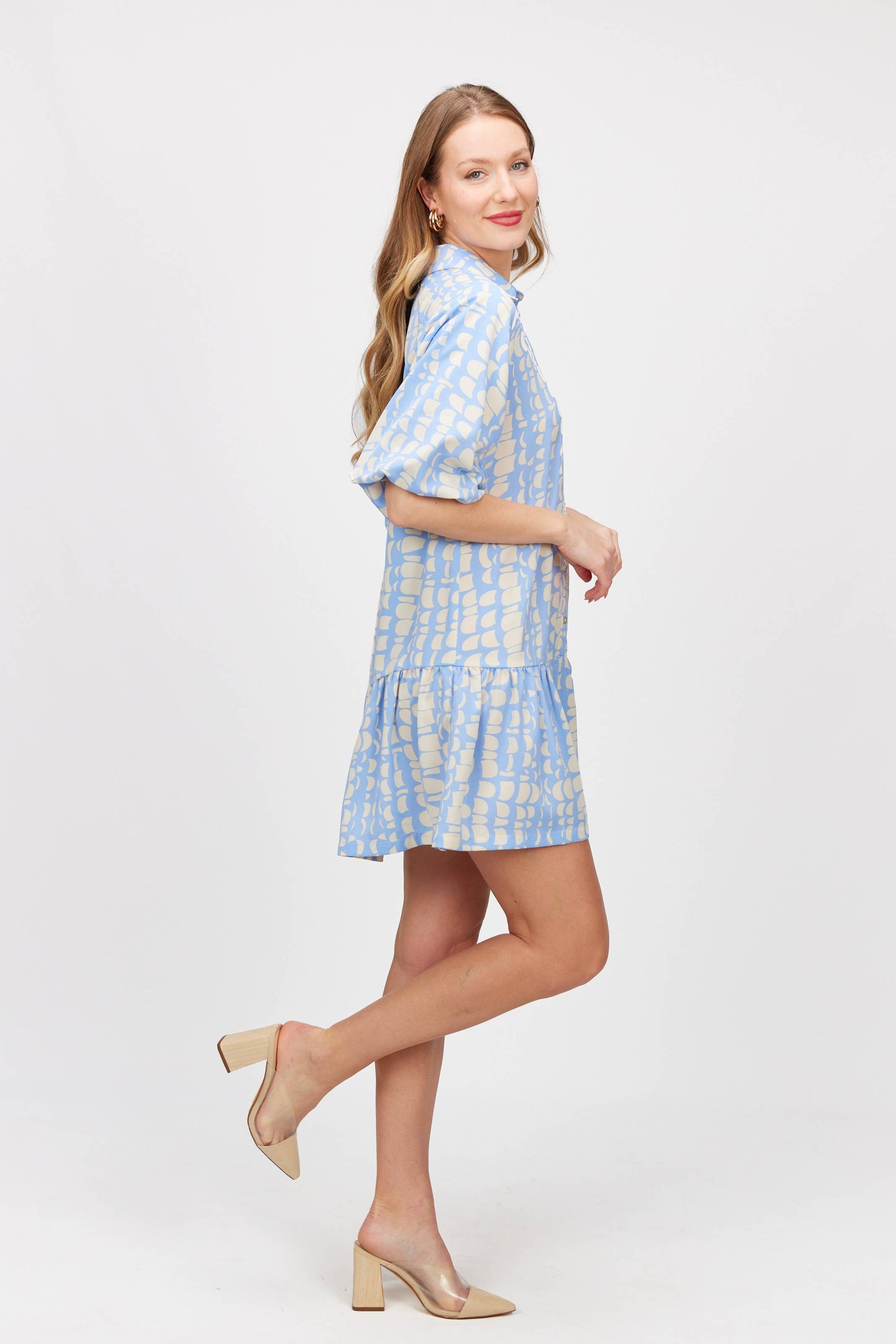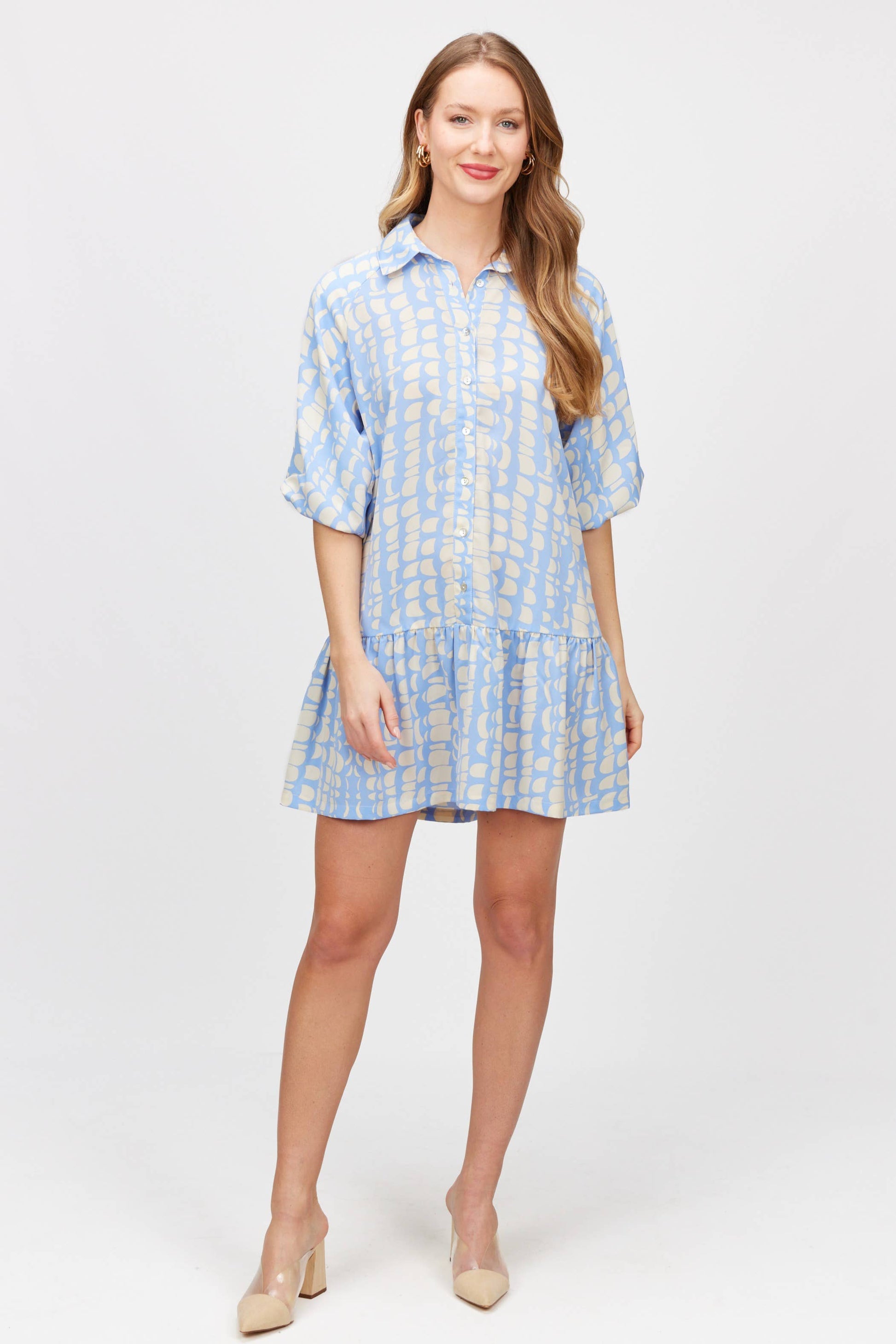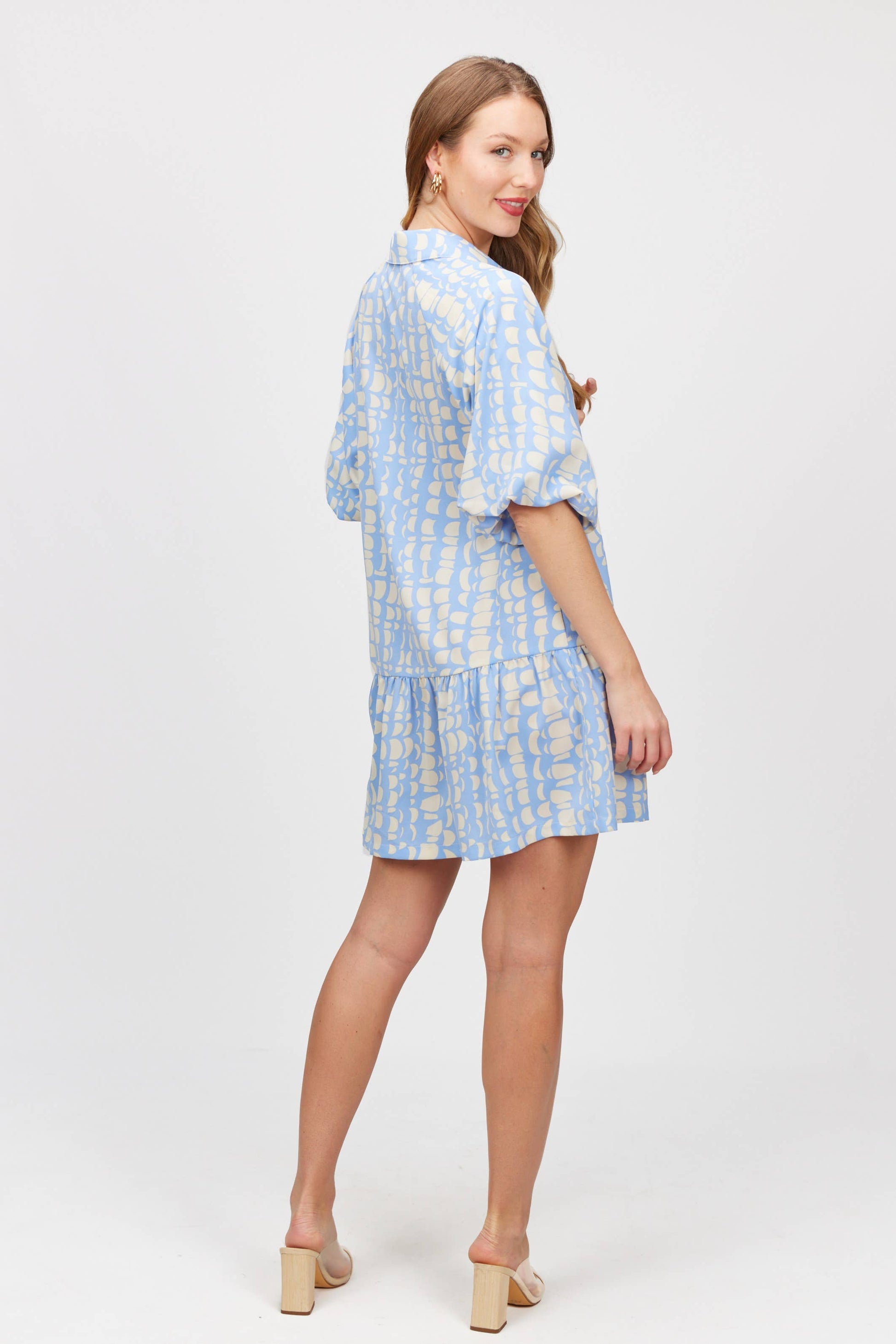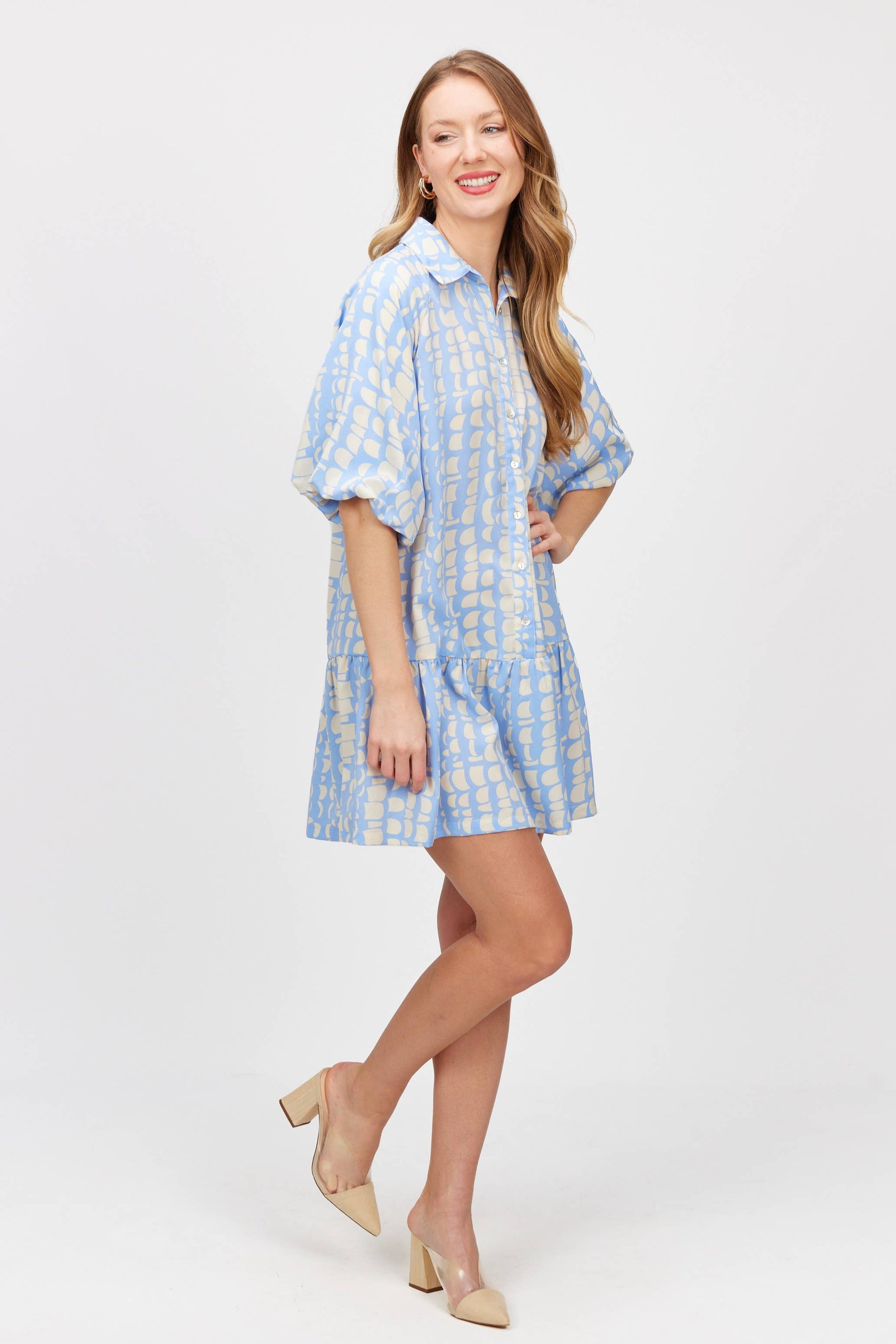 Featuring a vibrant geometric pattern, this dress makes a statement while keeping you comfortable. Designed with a classic button-up front, a collared neckline, and puff sleeves, it strikes the perfect balance between sophistication and playfulness.