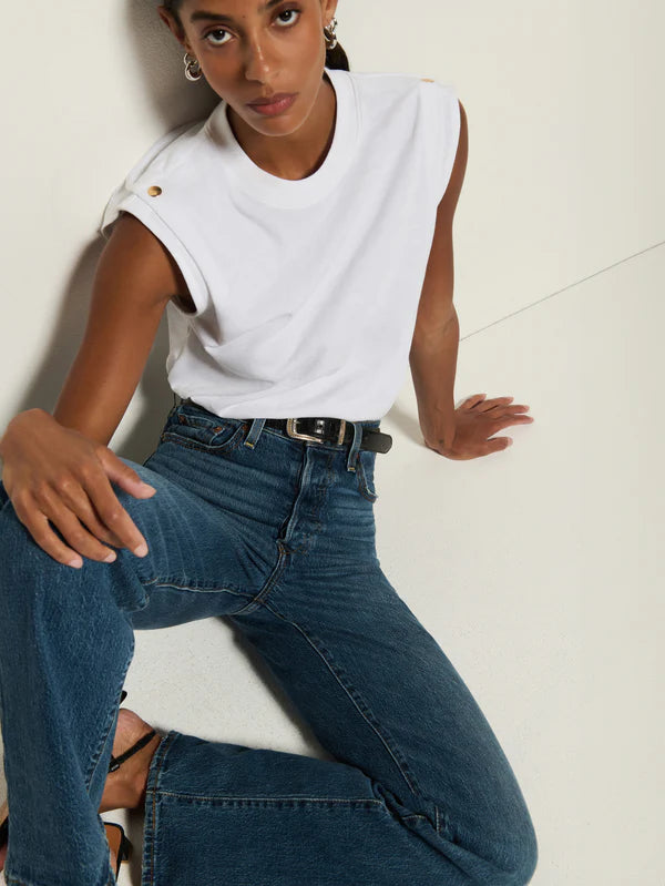 Your signature edgy muscle tee, with a little more flare-meet the Marina. Designed in cotton jersey, this tee features a relaxed bodice, our signature snap closure and crew neckline. This one comes in Dahlia.