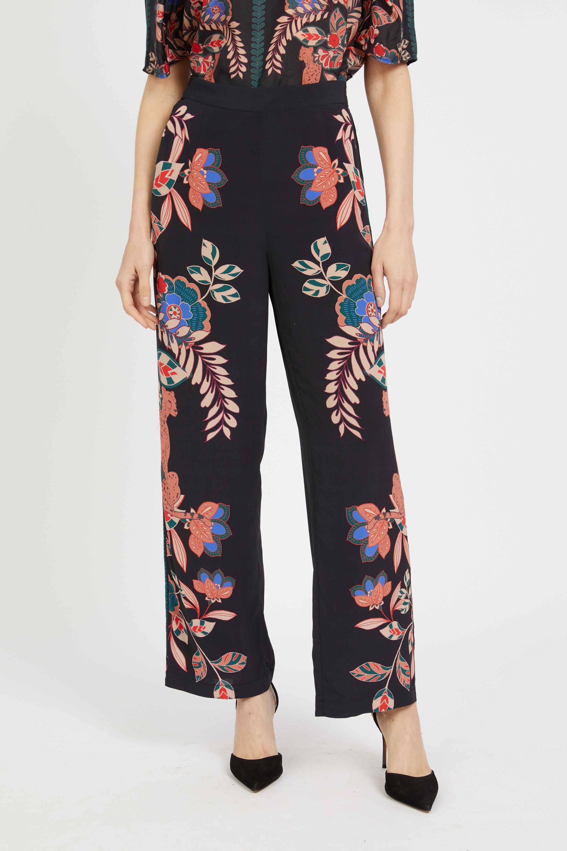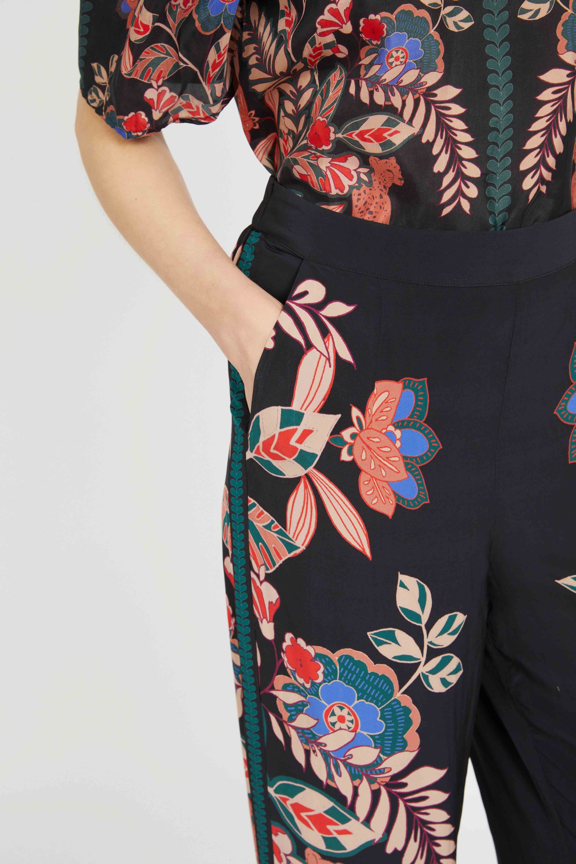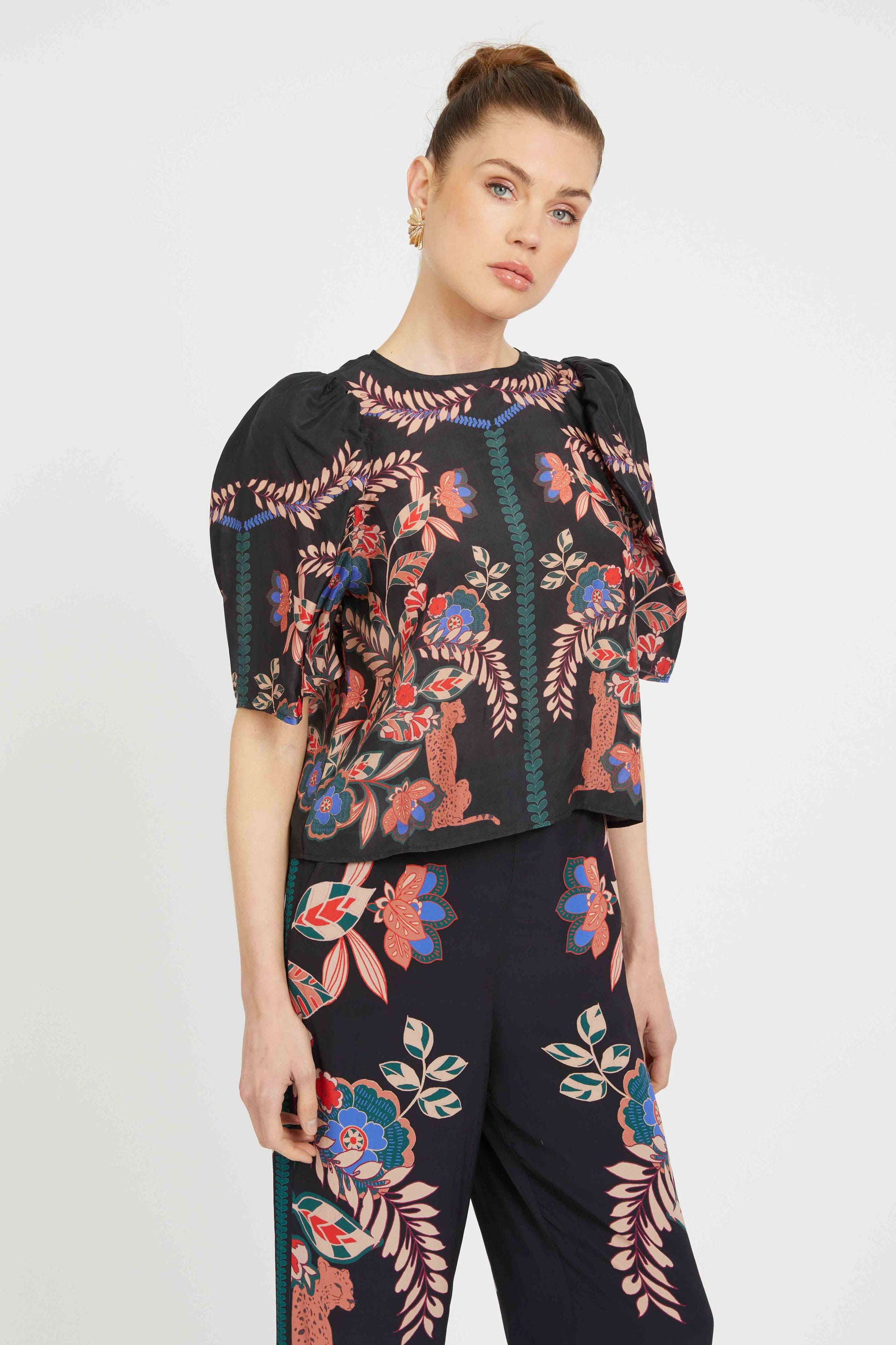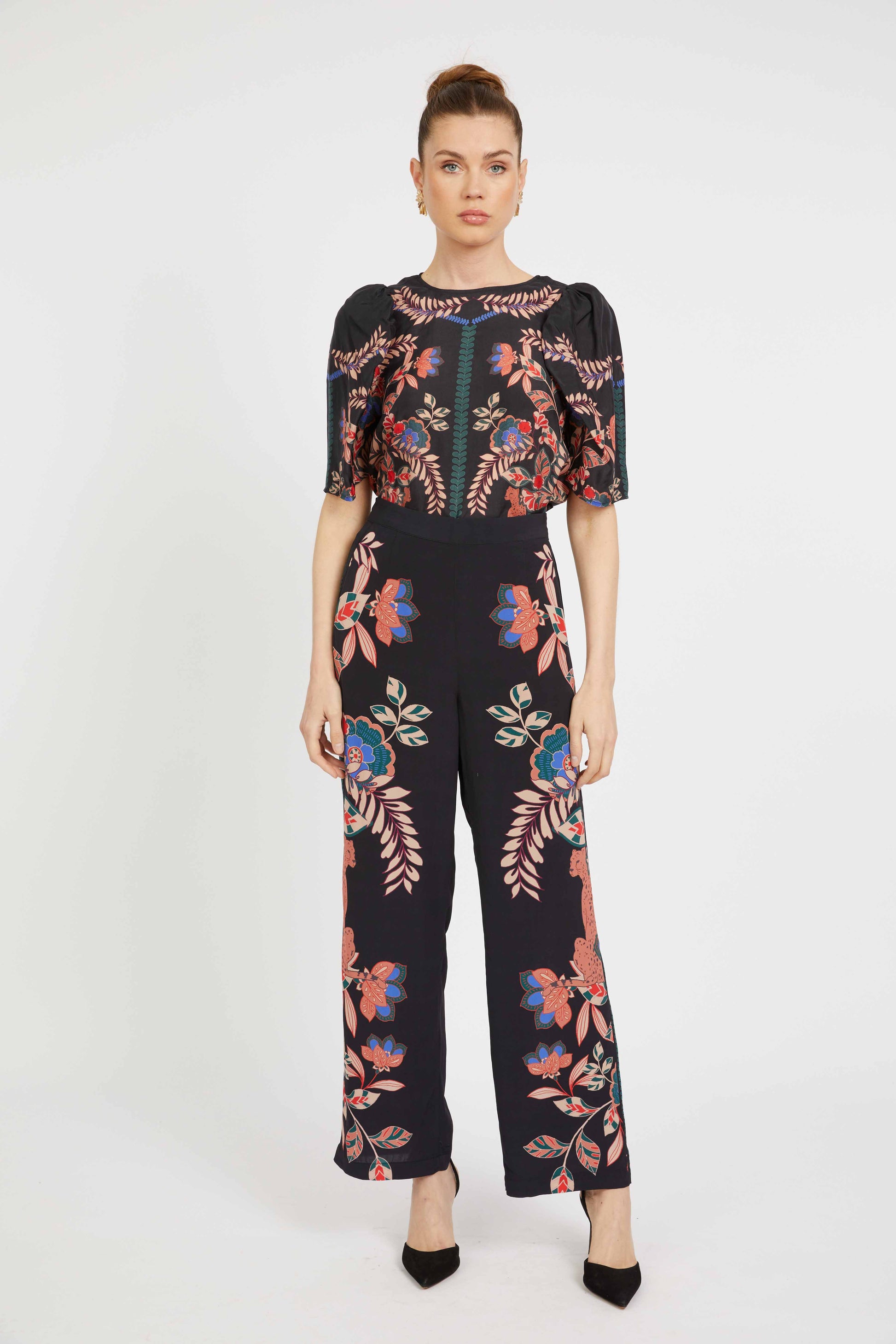 Crafted from Viscose, this iteration showcases a bold design with a leaf vine motif running down the side seams, framed by vibrant florals and stylized cheetahs against a deep black backdrop. With its soft, fluid drape and statement-making print, the Maxine Pant blends timeless elegance with standout style — perfect for both day and evening wear.