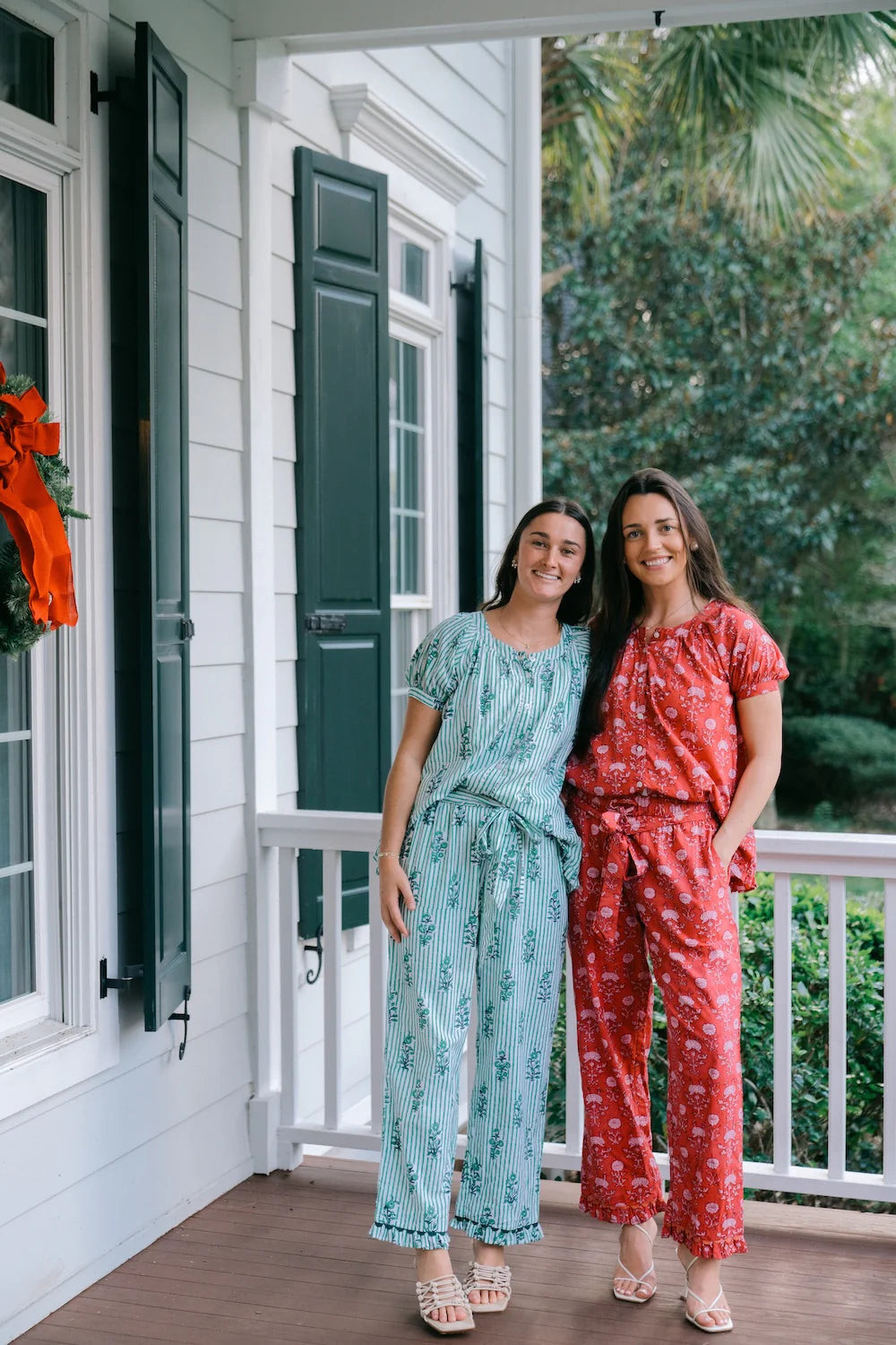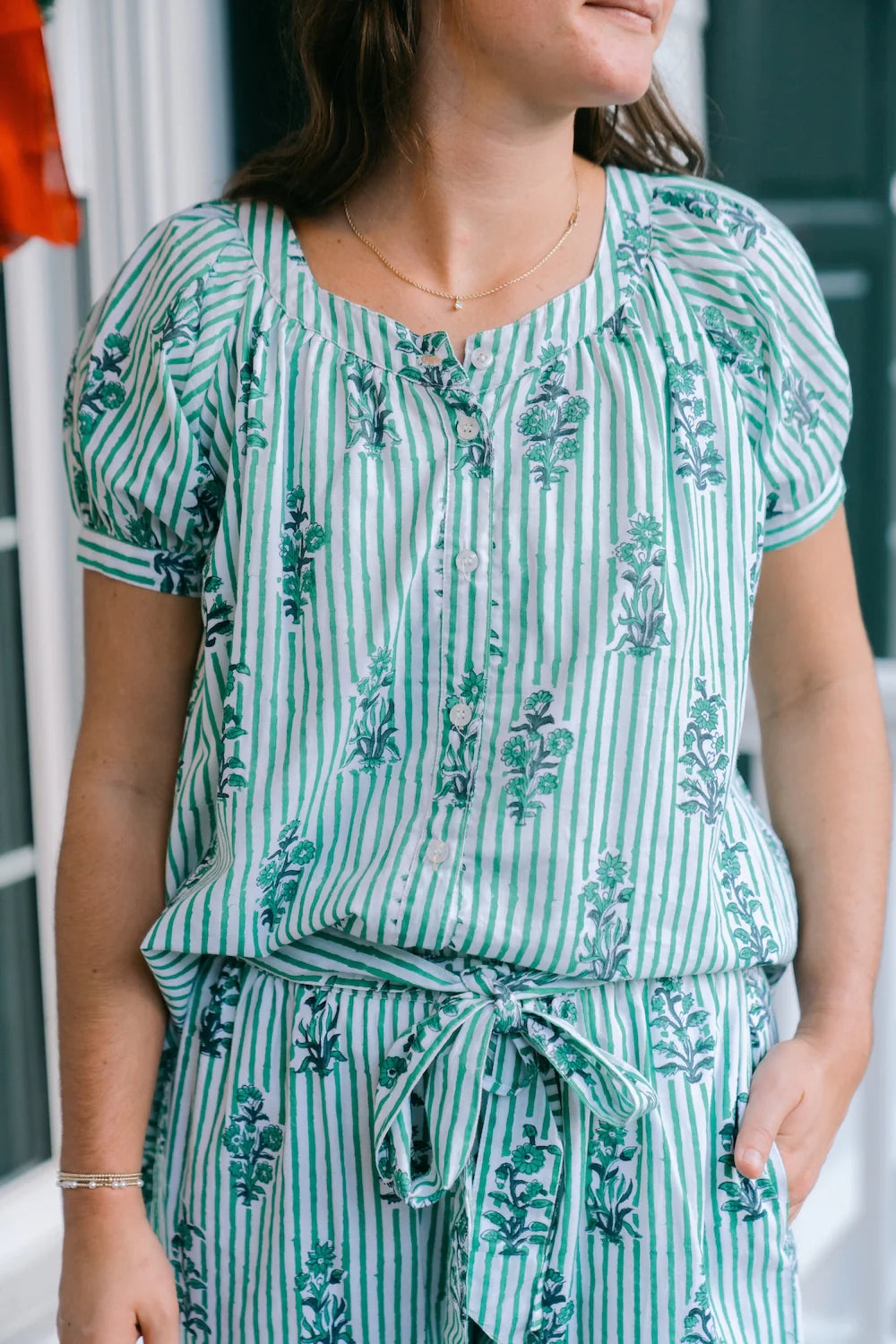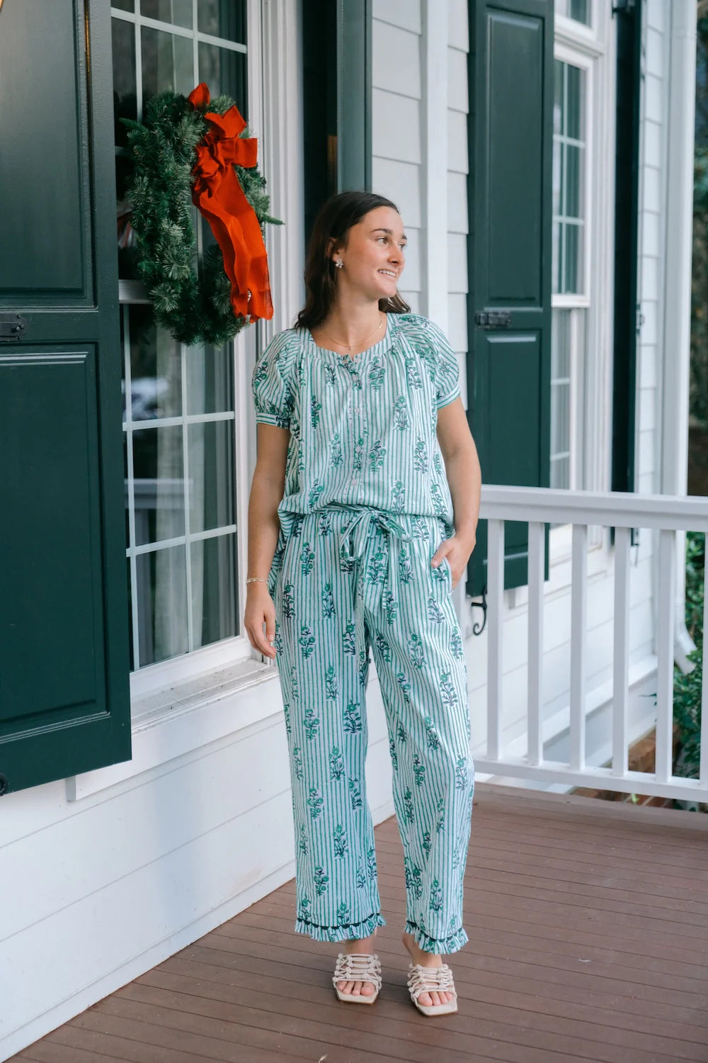 The Miley PJ Set features a button-down top with short puff sleeves and banded cuffs, complemented by a high-low silhouette and a ruffle tiered hem for a feminine touch. The elasticated drawstring pants offer adjustable ties and side pockets, finished with a delicate ruffle hem.