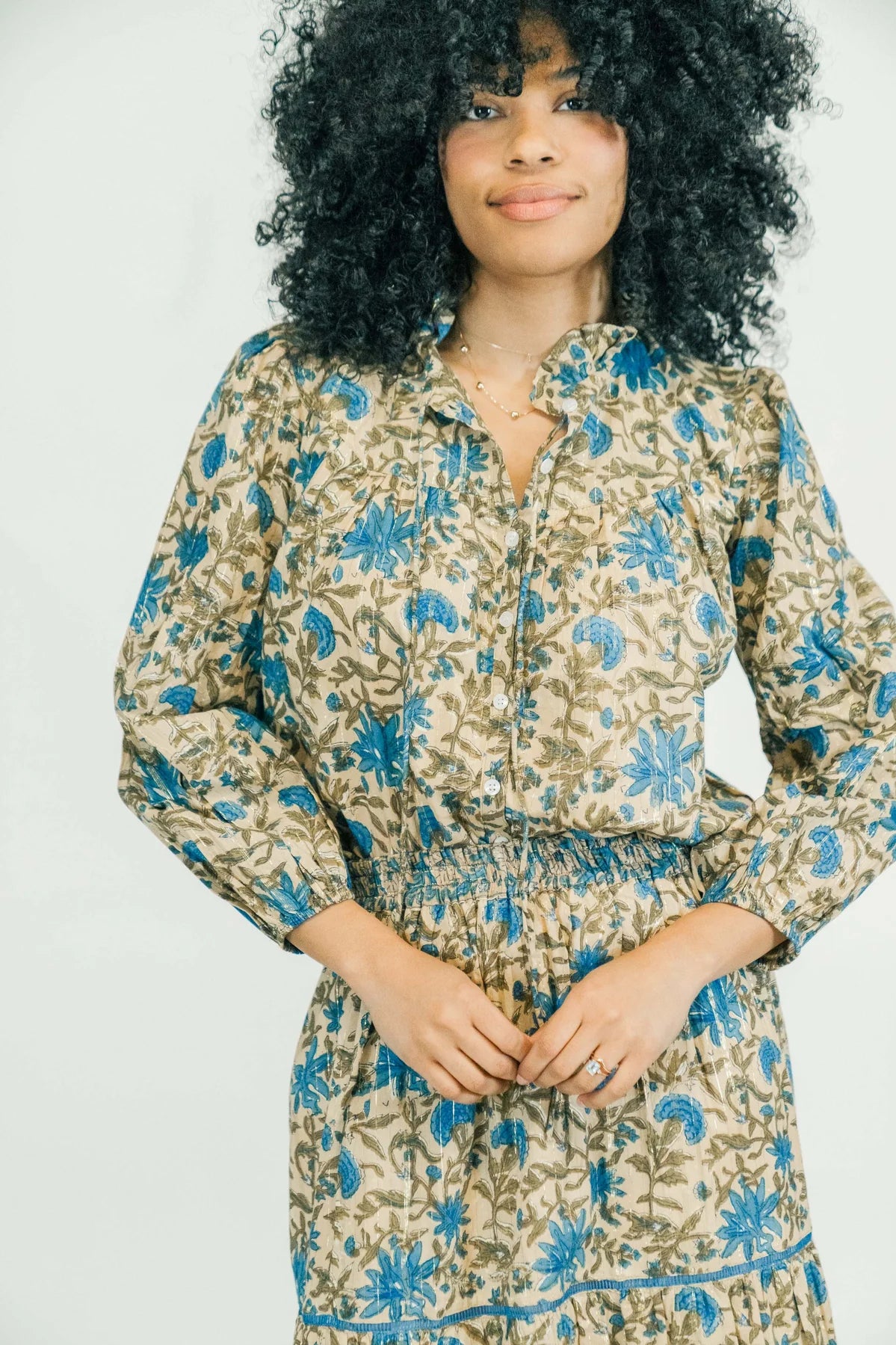 The Olive Blouse is our go-to blouse. It features a ruffled collar with an adjustable tie, long sleeves with an elasticated hem, and a front button closure. Pair with our Lana skirt for the perfect ensemble.