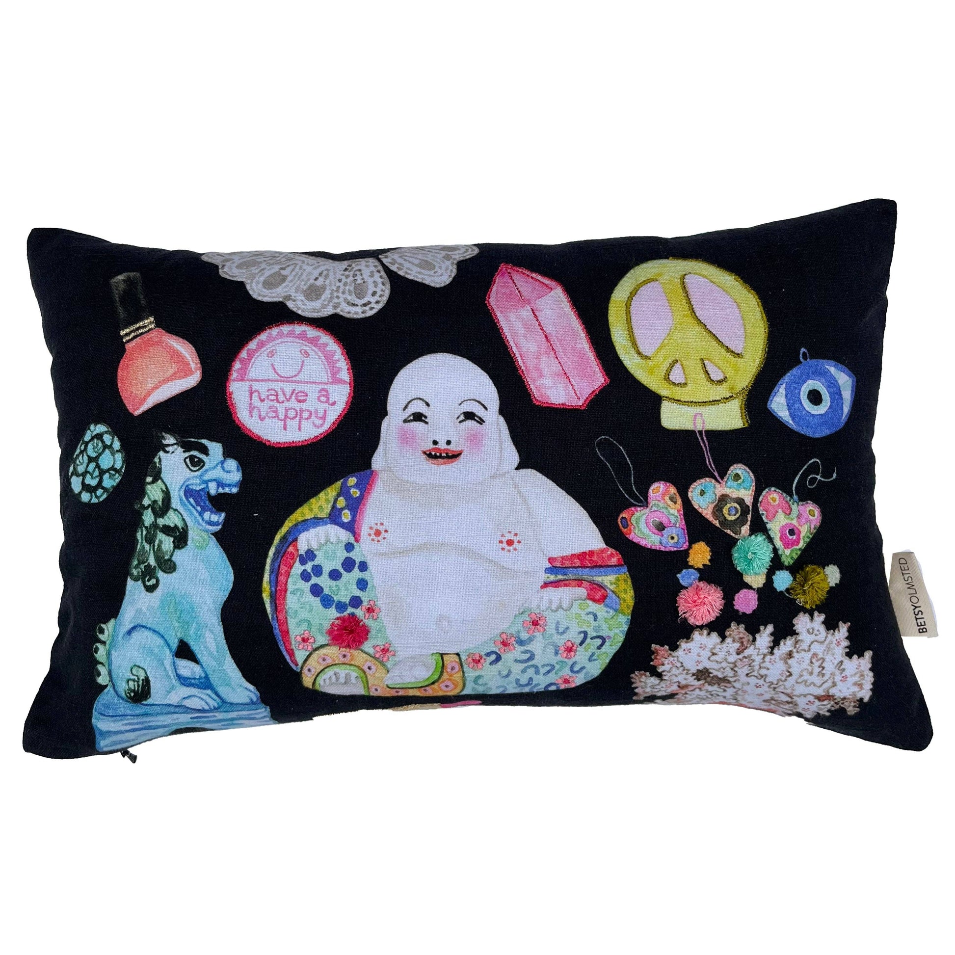 Printed with Betsy's original designs and embellished with embroidery, these petit pillows are full of color, texture, and personality. A master craftsperson carefully hand guides the embroidery machine needle over each printed piece to highlight the art with metallics and colors that reflect light and enhance character.