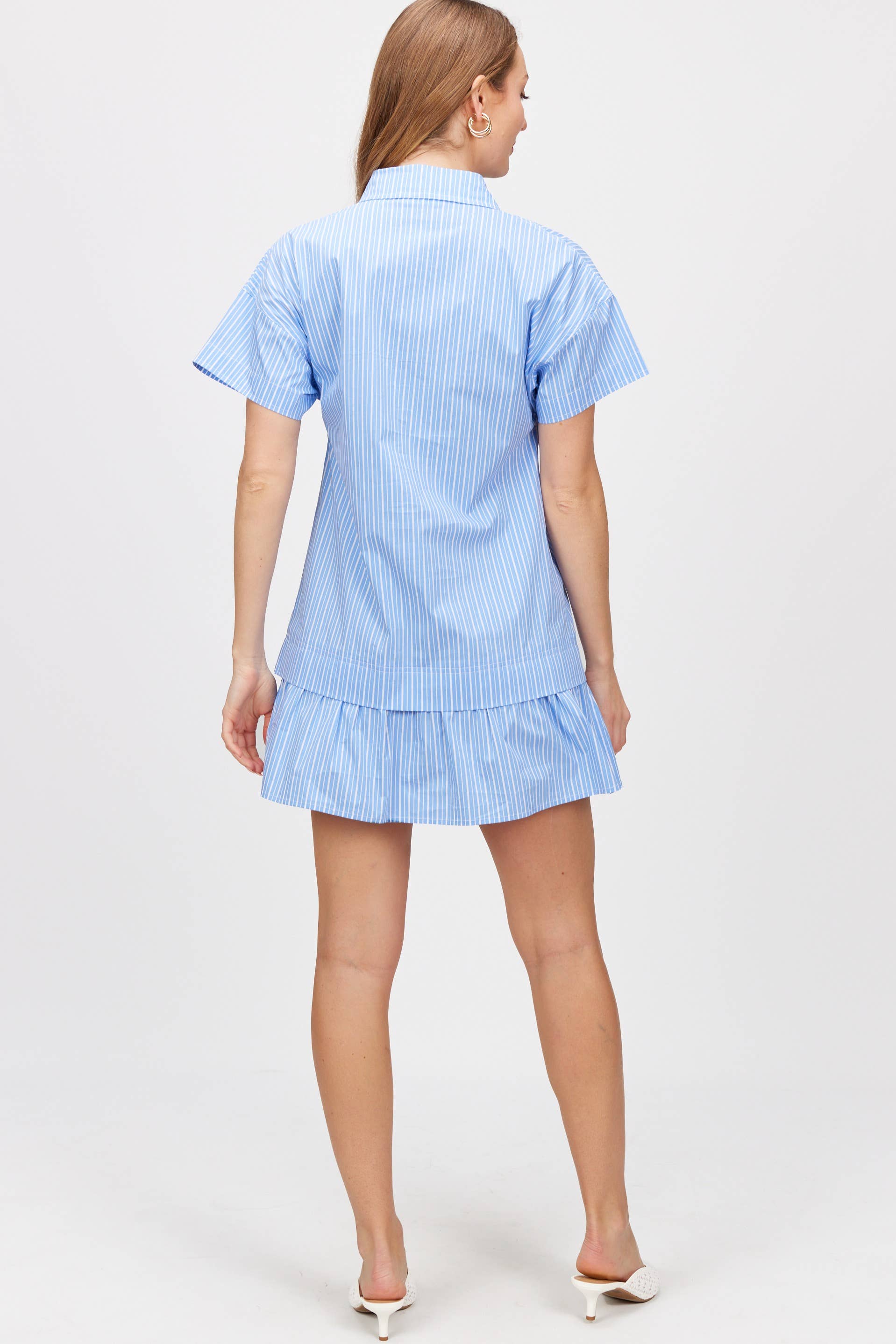 Designed with a structured collared neckline and classic pinstripes, this dress exudes timeless sophistication. The relaxed fit is complemented by a tiered ruffled hem, adding a playful and feminine touch.
