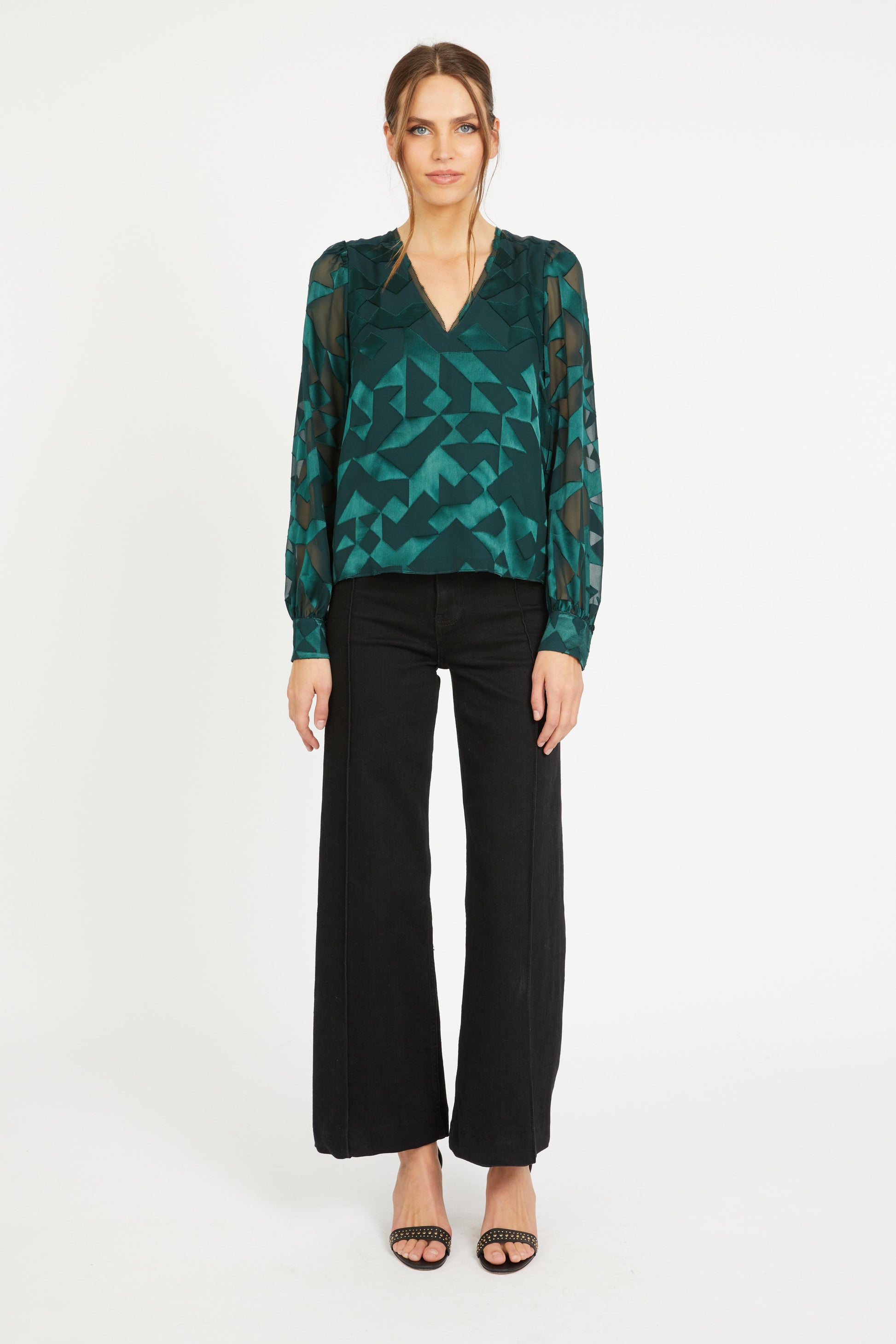 The Ruby Top is a long sleeve blouse crafted from a luxurious viscose-silk blend, adorned in our Sea Moss color. The blouson sleeves are finished with buttoned cuffs, adding a subtle tailored detail to the flowing silhouette. A flattering V-neckline and gentle shirring at the back neck enhance this emerald-colored top’s relaxed, easy fit.