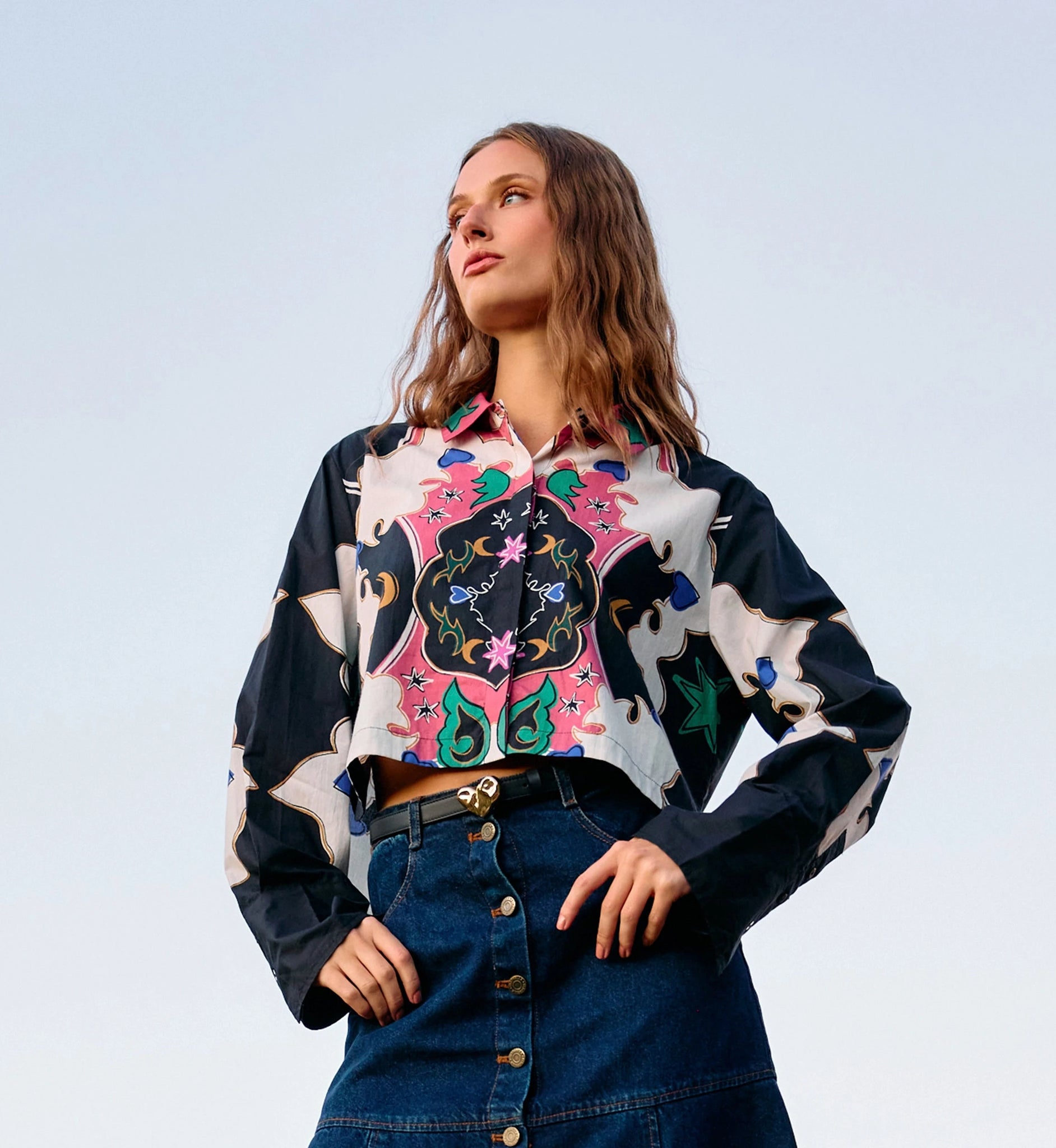 Ethically handmade in India from 100% GOTS-certified organic cotton, the Zoya Blouse brings effortless sophistication to your sustainable wardrobe. This long-sleeve button-down top features an elegant collar, extended cuffs, and an artful print that adds a bold yet refined touch. Pair it with your favorite Cleobella bottoms for a polished, statement-making look that transitions seamlessly from day to night.
